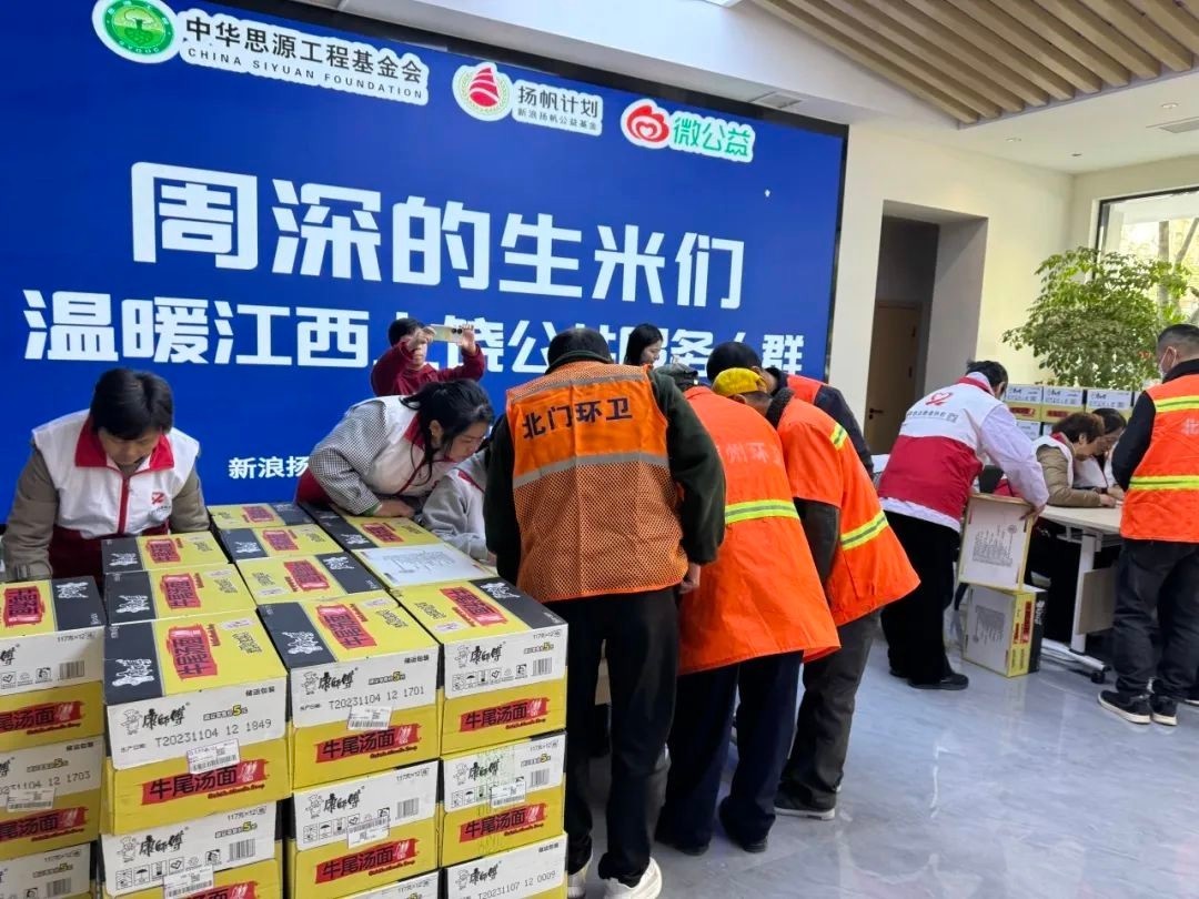 为安徽宿州、江西上饶等地的环卫工人、消防员送箱暖心泡面。